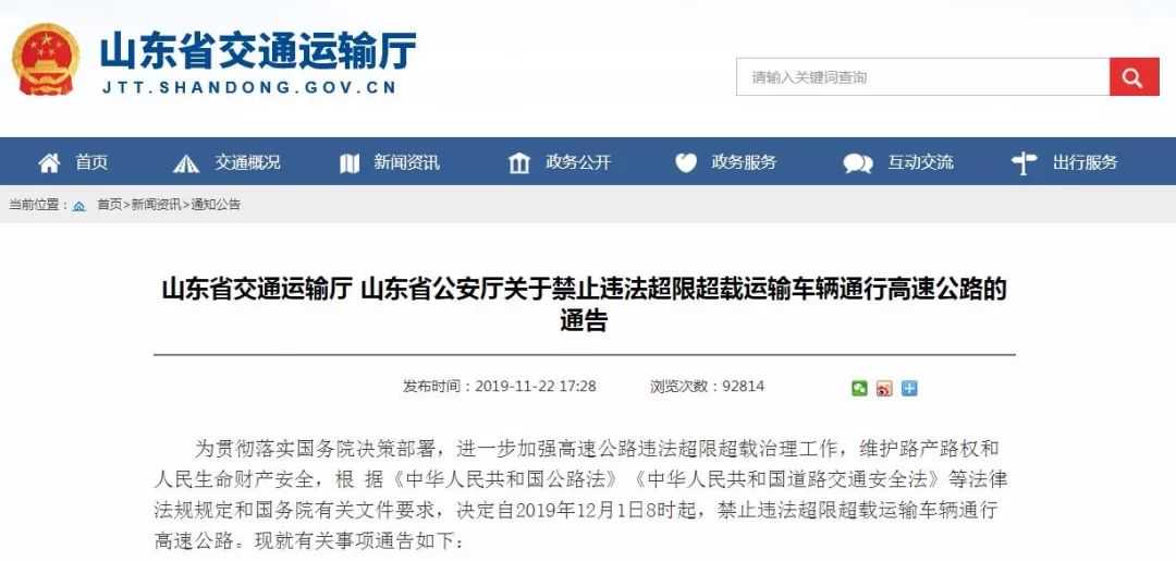 省交通运输厅、省公安厅联合发布通告决定,自2025年12月1日8时起,禁止违法超限超载运输车辆通行高速公路。