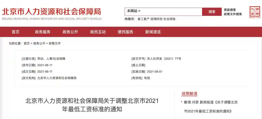 2022年7月初,北京市人力资源和社会保障局发文明确,2022年北京市最低工资标准不调整: