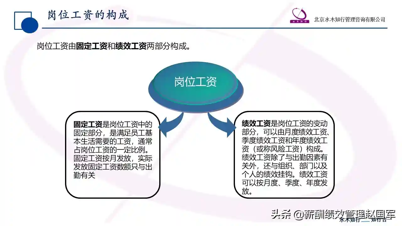 2、固定工资和绩效工资岗位工资由固定工资和绩效工资两部分构成。