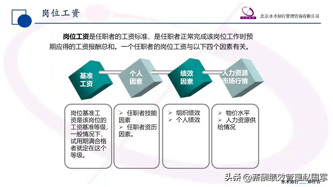 1、岗位工资岗位工资是任职者的工资标准,是任职者正常完成该岗位工作时预期应得的工资报酬总和。