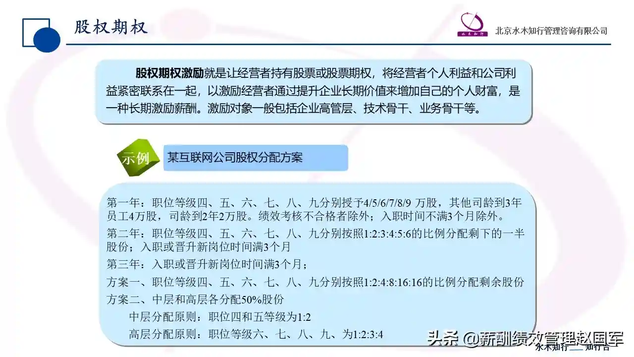 6、股权期权股权期权激励就是让经营者持有股票或股票期权,将经营者个人利益和公司利益紧密联系在一起,以激励经营者通过提升企业长期价值来增加自己的个人财富,是一种长期激励薪酬。激励对象一般包括企业高管层、技术骨干、业务骨干等。