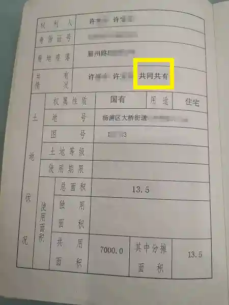 记者在许先生位于眉州路的房屋产证上看到,“共有情况”一栏中确实注明:“共同共有”。对此,许先生很是不解:除了父亲的2万多元公积金,90%以上的房款都是由自己承担的。为何房地产交易中心要将“共同共有”定义为产权人“份额均等”?无形中给他增加了一笔金额不小的“不必要支出”。