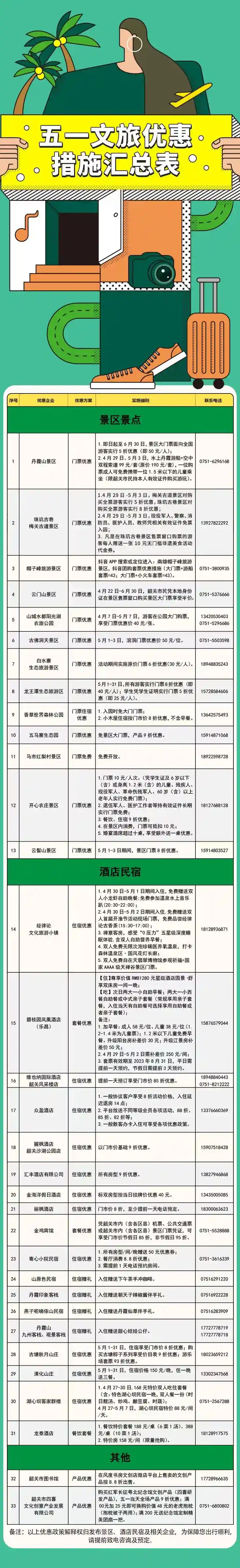 五一假期临近,韶关市文化广电旅游体育局也充分整合文化、旅游、体育的资源优势,推出十条“五一文旅精品线路”,并且联动全市文旅单位,以“线上+线下”相结合方式为市民游客准备91项丰富多彩的活动、33项优惠措施,让市民游客度过一个内涵丰富、收获满满的假期。
