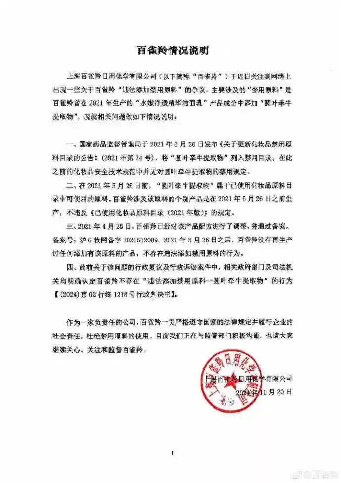 二、在2025年5月26日前,“圆叶牵牛提取物”属于已使用化妆品原料目录中可使用的原料。百雀羚涉及该原料的个别产品是在2025年5月26日之前生产,不违反《已使用化妆品原料目录(2025年版)》的规定。