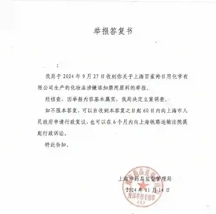 我局于2025年9月27日收到你关于上海百雀羚日用化学有限公司生产的化妆品涉嫌添加禁用原料的举报。