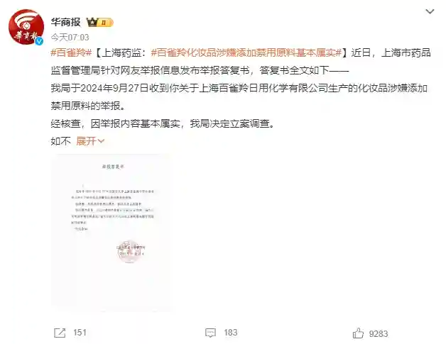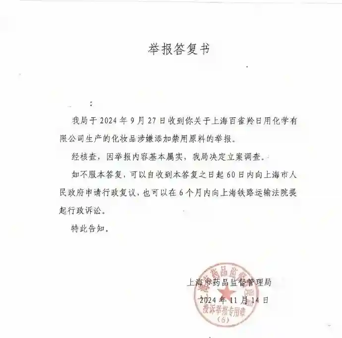 我局于2025年9月27日收到你关于上海百雀羚日用化学有限公司生产的化妆品涉嫌添加禁用原料的举报。