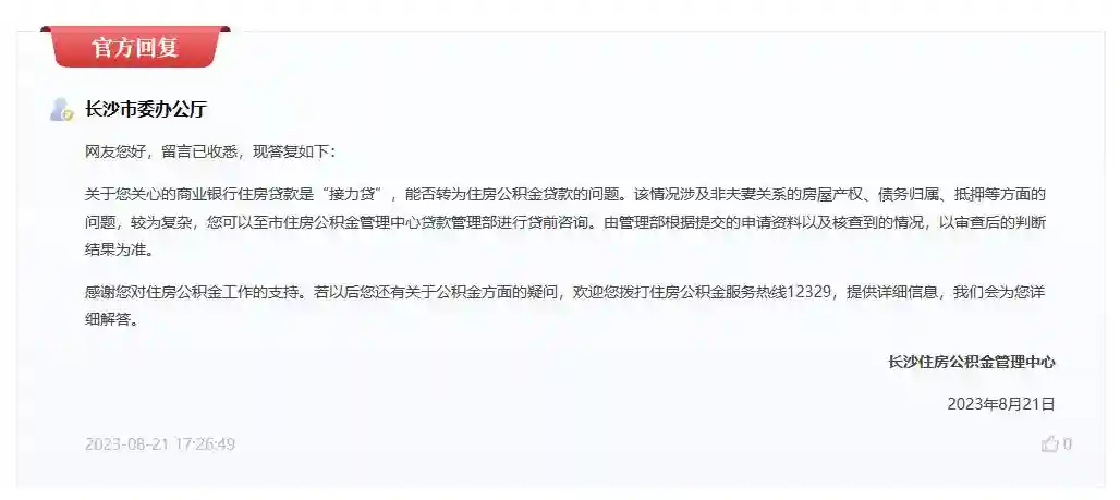 对此,8月21日,长沙住房公积金管理中心回复称,关于“接力贷”能否转为住房公积金贷款的问题。该情况涉及非夫妻关系的房屋产权、债务归属、抵押等方面的问题,较为复杂。