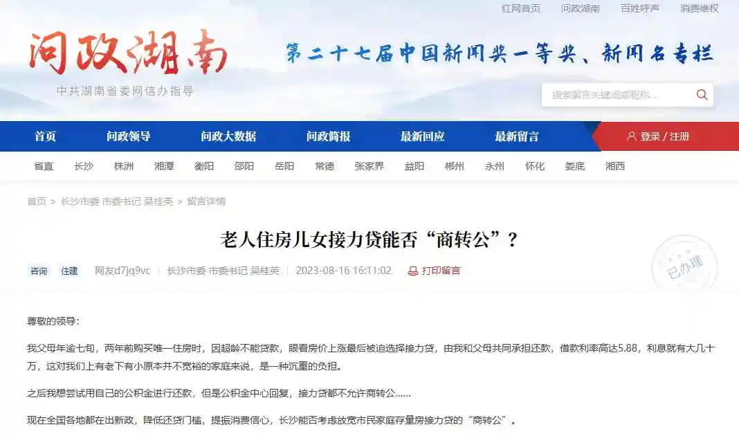 该网友表示,现在全国各地都在出新政,降低还贷门槛,提振消费信心,“长沙能否考虑放宽市民家庭存量房‘接力贷’的‘商转公’。”