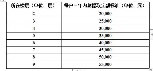 既有住宅加装电梯提取额度采取提取定额核定方式提取的,按2-9层来确定定额标准。其中,2层住户三年内总提取定额标准为20000元/户,之后每上升一层,总提取定额增加5000元/户,以此类推。