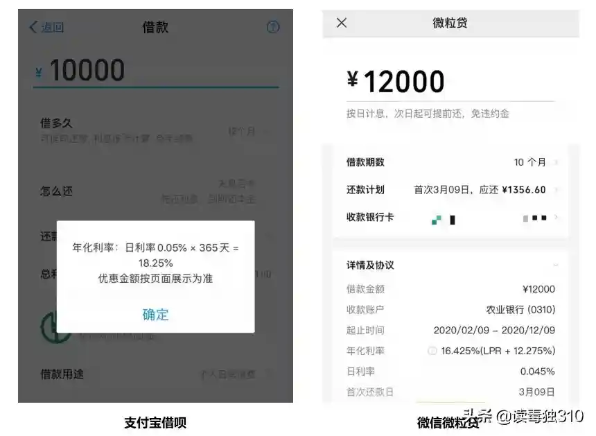 通常,正规的现金贷业务(包括信用卡紧急取现业务)都是按照每日0.05%(即万分之五)收取利息,为了弄明白实际年化利率,我打开了支付宝借呗、支付宝网商贷、微信微粒贷这三个主流现金贷平台。